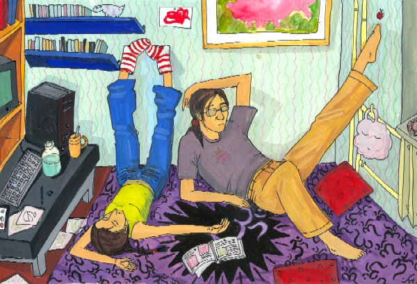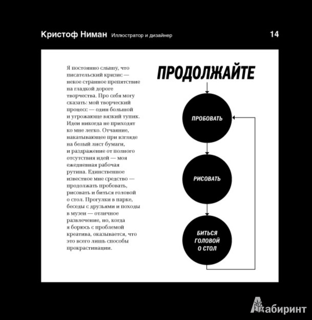 Впрочем, если вы не ленитесь гуглить незнакомцев, вас ждет несколько очень приятных знакомств — я вот открыла для себя пару иллюстраторов и дизайнеров. И заодно в процессе убедилась, что если бы главки-советы от каждой персоны сопровождались иллюстрациями — скажем, для художников это могли бы быть 1-2 рисунка, а для невизуалов, писателей и музыкантов, рабочие места, студии, портреты, — впечатление было бы куда более живым, а сама книга — более контактной.