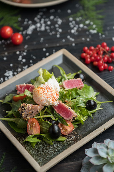 Реквизитом может стать всё, что есть под рукой: упаковочная бумага, разделочные доски, прихватки и фартук, сама посуда. Лучше использовать матовые тарелки и приборы — глянцевая поверхность и блестящий металл будут бликовать. Ещё можно дополнить кадр ингредиентами блюда. Пирог на посыпанном мукой столе или свежая зелень рядом с тарелкой салата украсят снимок и покажут, что еда свежая.