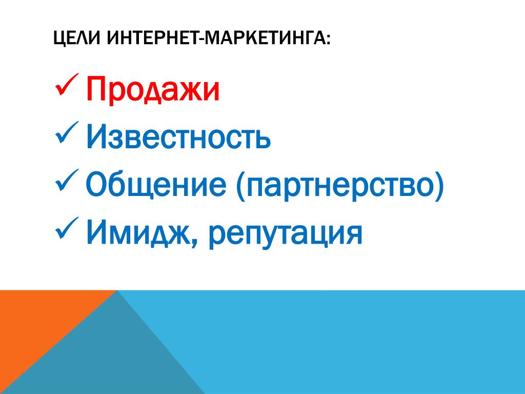 Главные цели и задачи интернет-маркетинга это: рост продаж, популярности компании, посещаемости сайта, привлечение клиентов и повышение их лояльности. Особенностями онлайн-маркетинга являются большое количество инструментов и широкая вариативность их использования.