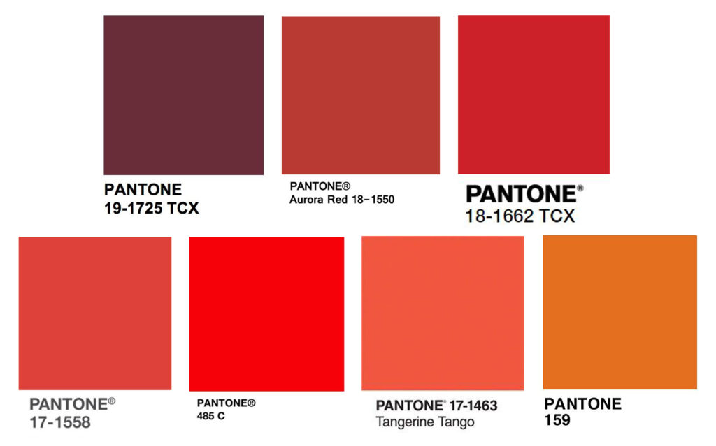 Оттенки алого в системе Pantone включают в себя такие тона, как Гринадин, томат Черри, Фиеста, красно-оранжевый.