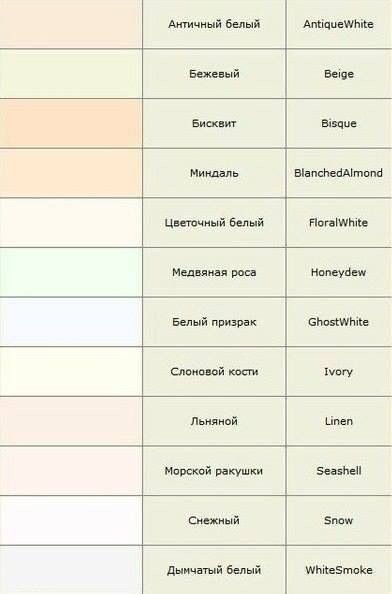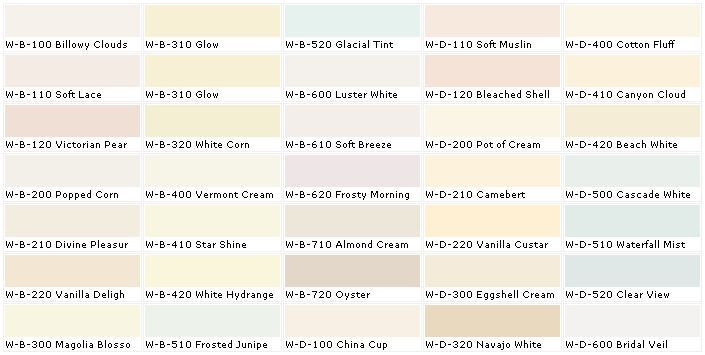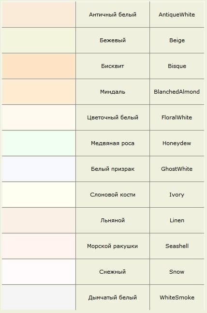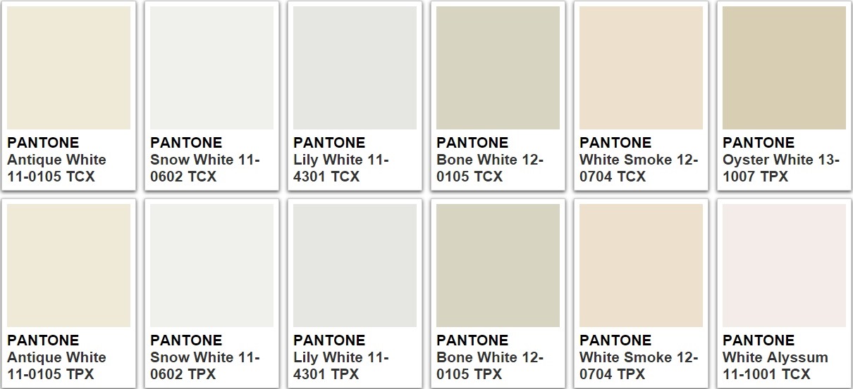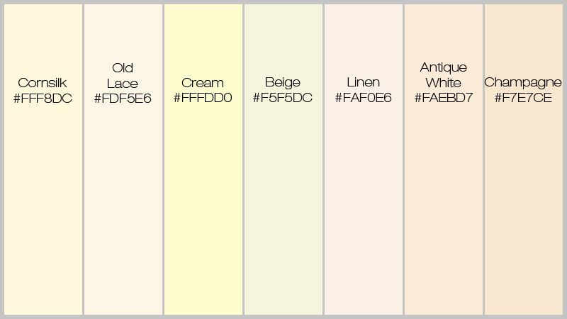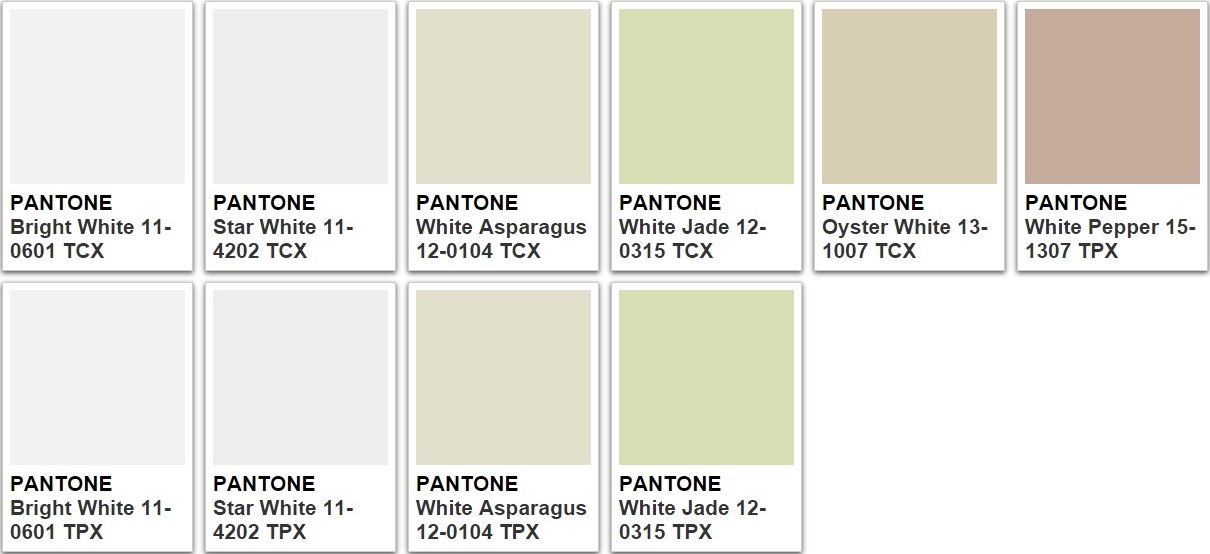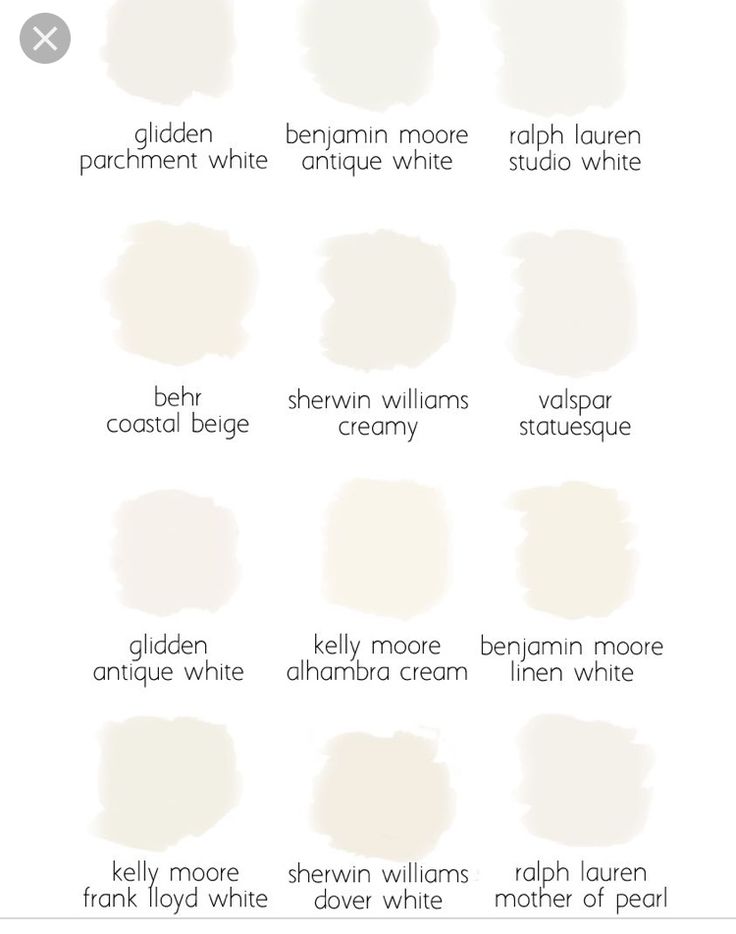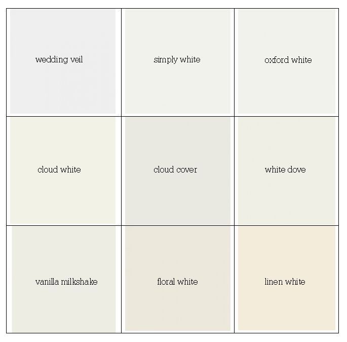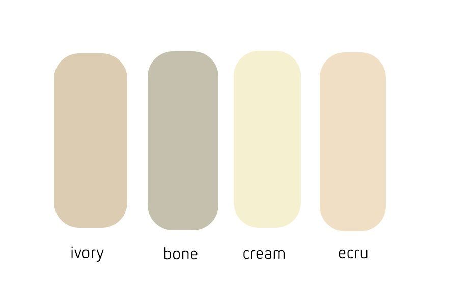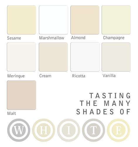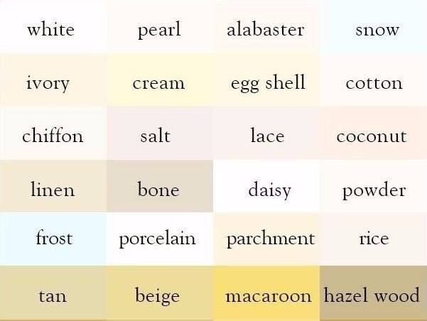 Цвета, которые часто считаются «оттенками белого», включают в себя: крем, яичную скорлупу, слоновую кость, белое навахо и ваниль. Однако даже освещение комнаты может привести к тому, что чистый белый цвет будет восприниматься как не совсем белый. CMYK