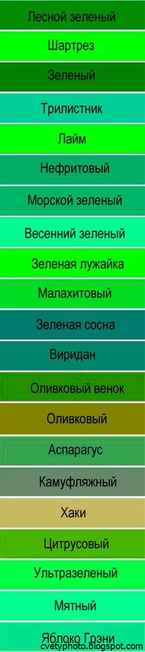 Названия всех оттенков зеленого цвета очень сложно перечесть, ведь их насчитывается около нескольких тысяч. Однако можно сосредоточить свое внимание на самых распространенных из них, которые, в свою очередь, имеют массу собственных расцветок.