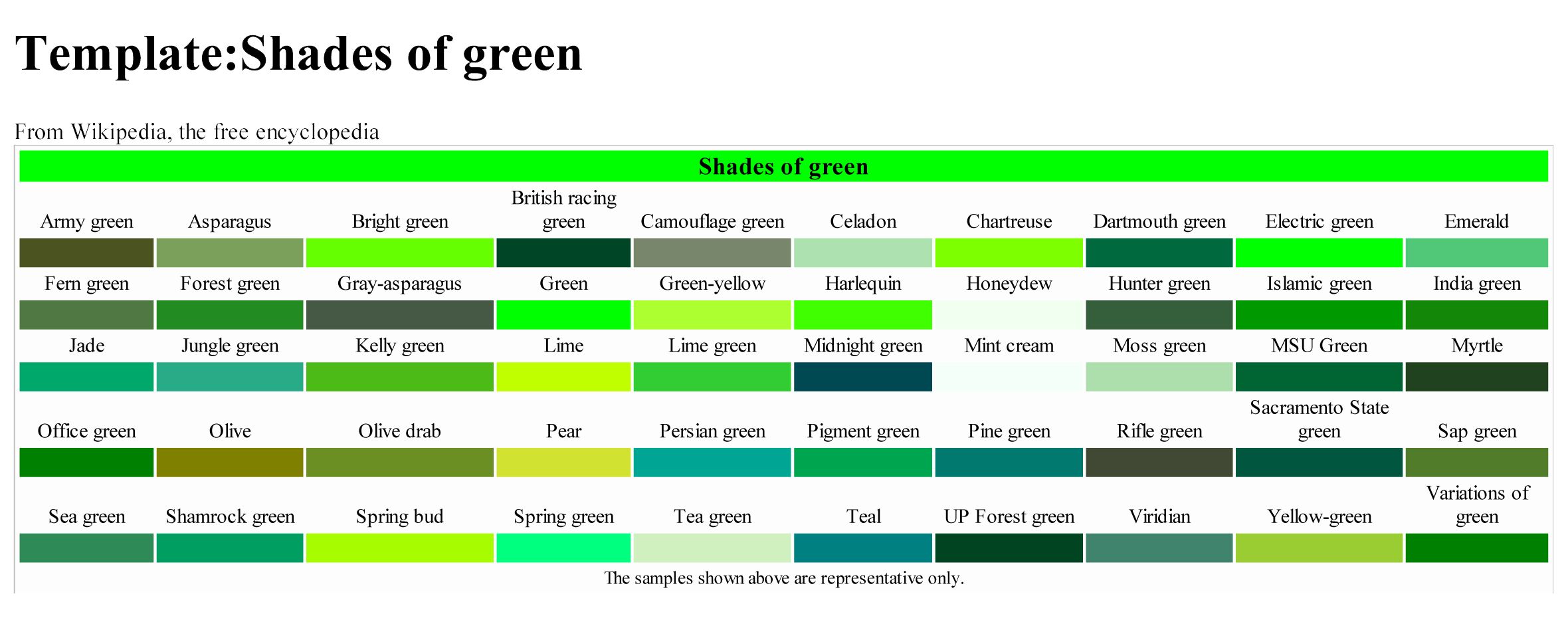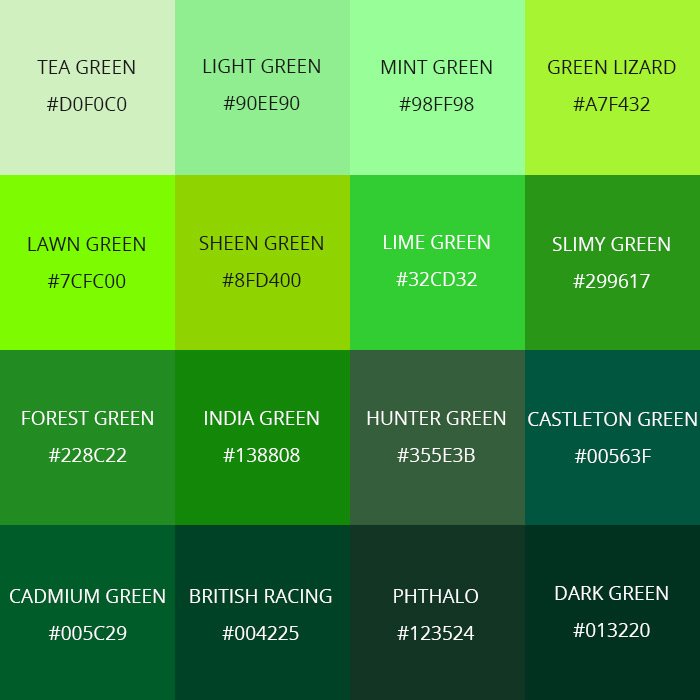 Зеленый цвет имеет большое количество всевозможных оттенков, выбрать из которых бывает весьма затруднительно. Вот только несколько оттенков: цвет спаржи, оливковый, сосна, зеленый чай, малахит, лайм, изумрудный, желто-зеленый, бутылочного стекла…