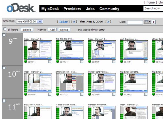 ПО oDesk засекает время по 10 минут. Причем оно засекает промежутки, кратные 10, то есть xx:00-xx-10, xx:10-xx:20, … В течение этих десяти минут в случайное время делается скриншот вашего экрана, но только один скриншот в 10 минут. Таким образом, если в текущие 10 минут уже был сделан скриншот, то не стоит бояться, что он сфотографирует что-то еще, и можно смело сидеть в Вконтактике оставшееся время. Не стоит также переживать, если скриншот сделан, когда вы занимались чем-то не тем: можно удалить его сразу на сайте и заказчик даже не узнает этого, просто вы потеряете деньги за 10 минут.