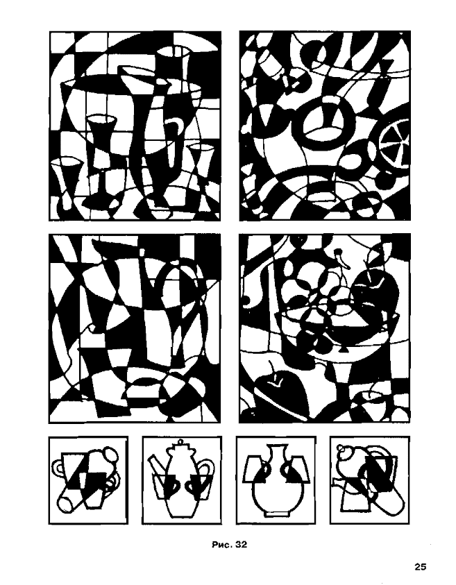 (Рисунок с членением плоскости). А теперь посмотрите, ребята, на все представленные композиции. Как предметы расположены на плоскости, они разрознены или как-то собраны?