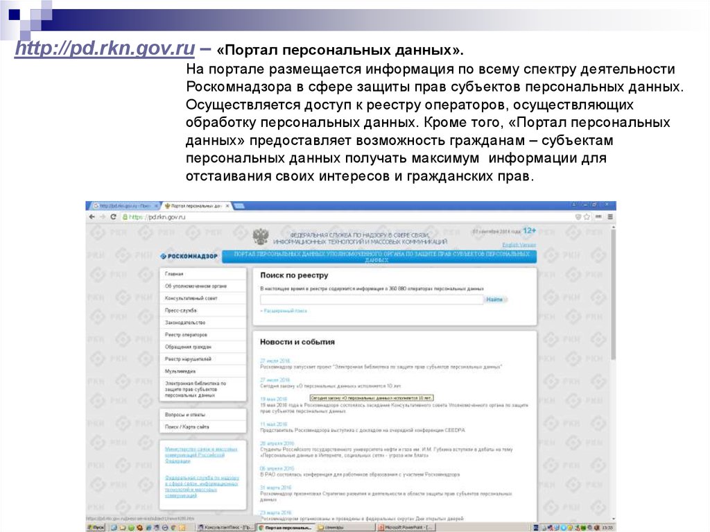 Подробная информация по всему спектру деятельности Роскомнадзора в сфере защиты прав субъектов персональных данных размещена на сайте Роскомнадзора (http://rkn.gov.ru), на Портале персональных данных Уполномоченного органа по защите прав субъектов персональных данных (http://pd.rkn.gov.ru), на сайте Управления Роскомнадзора по Южному федеральному округу (http://23.rkn.gov.ru). Доступ к реестру операторов, осуществляющих обработку персональных данных, размещен на сайте Роскомнадзора (http://rkn.gov.ru/personal-data/register/).