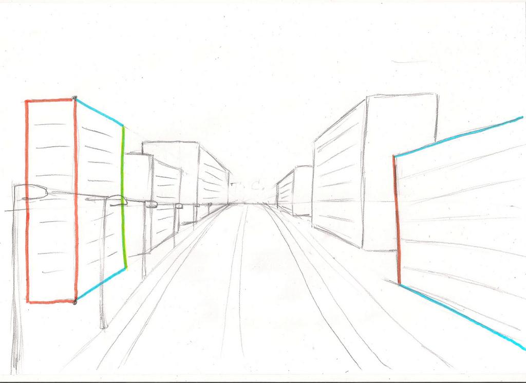 Но точки схода будут по прежнему располагаться на линии горизонта. Однако одна будет близко к объекту, а другая — довольно далеко. Скорее всего вам понадобится приклеить листы по бокам, чтобы найти ее с помощью линейки.