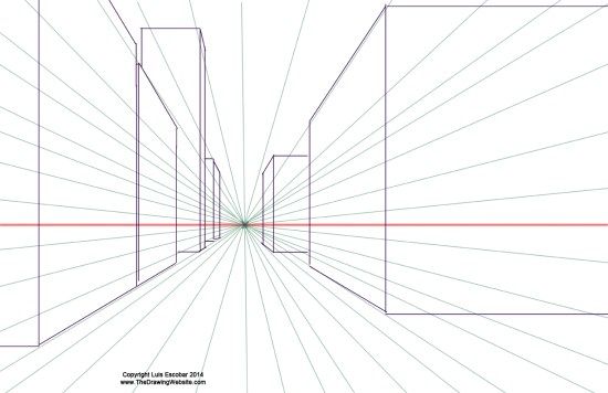 Соответственно все остальные линии, должны пересечься на линии горизонта. Если все предметы стоят параллельно друг другу, то точка схода будет одна и та же для всех: