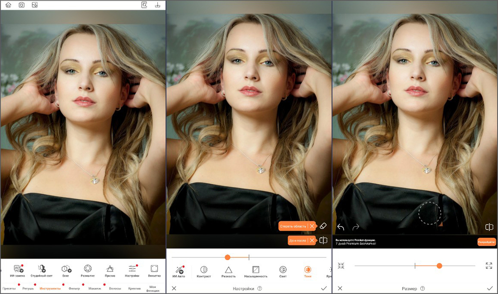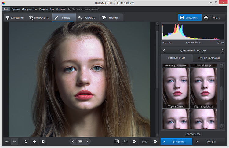 Идеальный портрет — уникальный раздел, предназначенный для ретуши портретов. Здесь можно применить готовые стили: произвести общее или легкое улучшение, добавить легкий загар, убрать блеск и красноту или применить «Эффектный портрет» для глянцевой ретуши. Также можно выполнить ретушь вручную и проработать самостоятельно кожу, глаза, брови, губы и зубы.