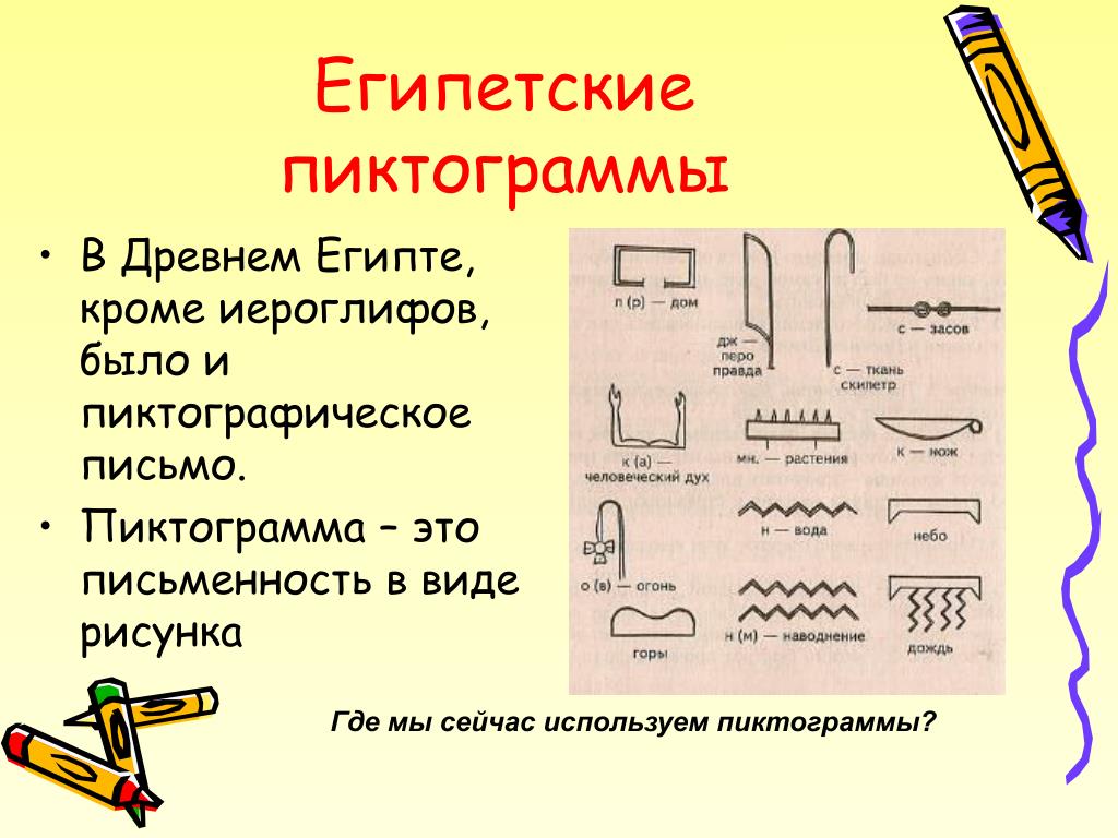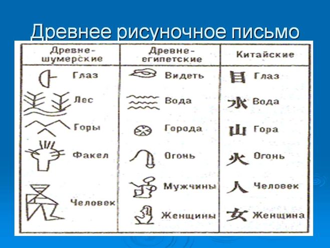 Ученые предполагают, что знаки, непосредственно изображающие предметы или понятия, были предшественниками современных букв алфавита. В письменности Древнего Египта пиктограммы на много веков остались практически неизменными, в них легко узнать конкретные объекты, например птиц.