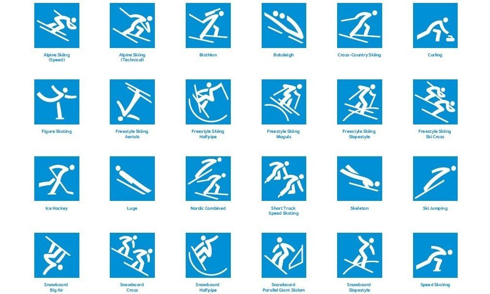 Каждая пиктограмма состоит из оси симметрии и изображения вида спорта, который она иллюстрирует.