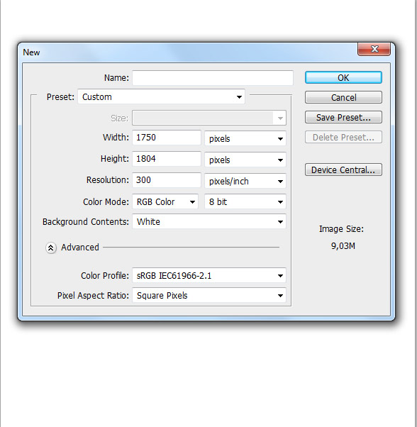 - Откройте Photoshop и создайте новый документ ( Файл > Новый ).