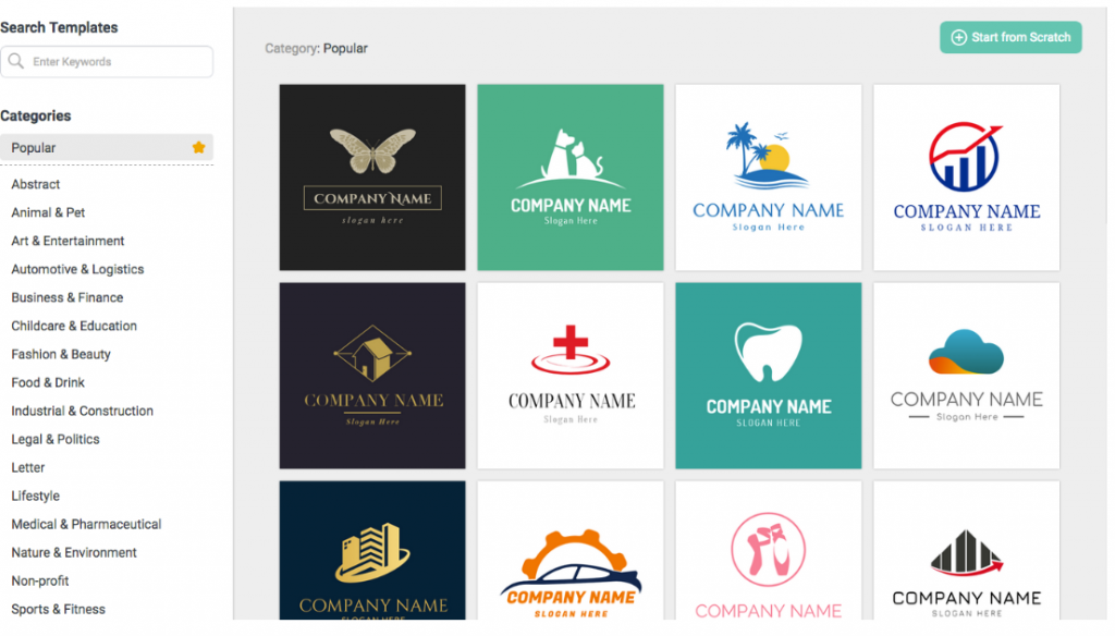 Вам нужно только ввести название компании и выбрать графические элементы (доступен поиск по ключевым словам). Можно настроить цвет, шрифт и ориентацию элементов.