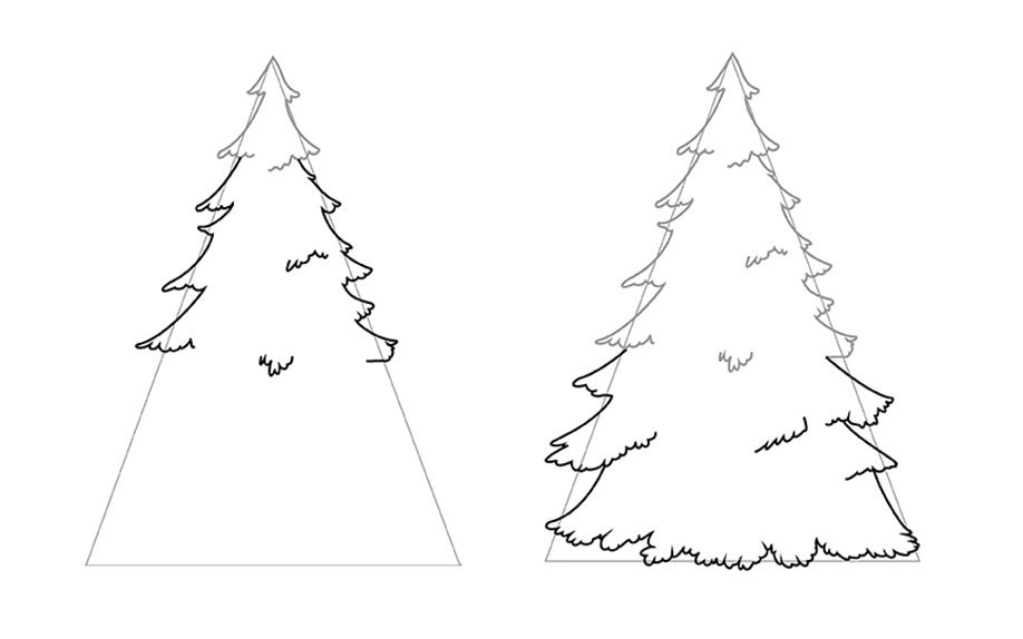 Начинаем вырисовывать контур елочки, применяя полученные линии наброска.