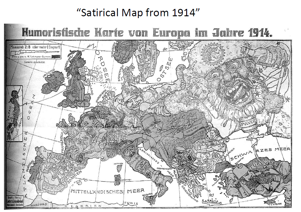 Россия, ведущая агрессивную военную политику, на этих картах показана как каток или буйный медведь, тянущий лапы к чужим территориям. Растянутая по всему миру Британская империя — огромный матрос. Зачинщица Первой мировой войны Германия — лающая собака, а пытающиеся сохранять нейтралитет Италия и Испания — карабинер и матадор, готовые ударить в спину. С помощью лаконичных образов авторам удавалось передавать актуальную политическую ситуацию.