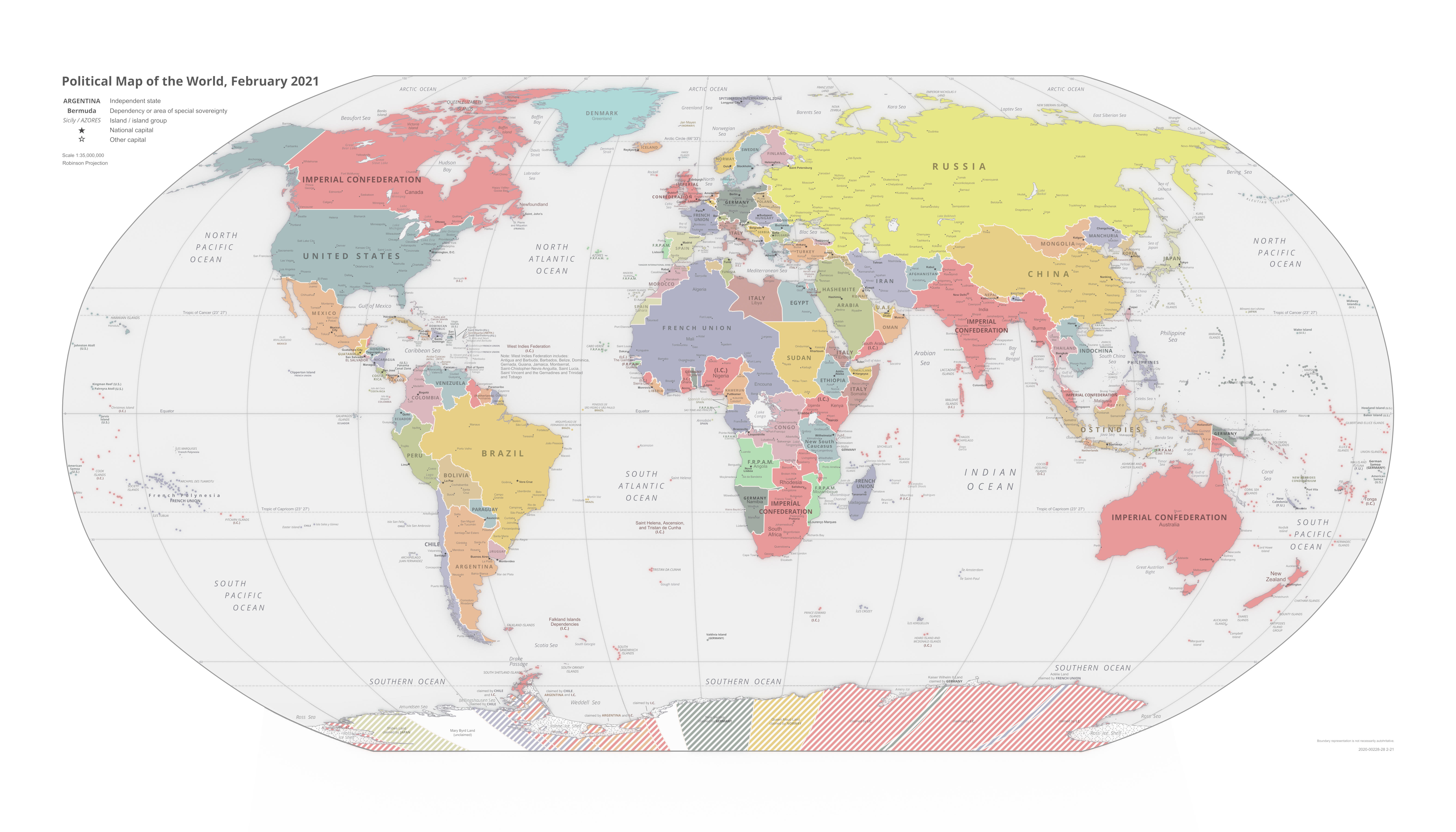 Австралийцы не только проводят вертикальную ось мира через свой материк, так еще и помещают его сверху всех других, переворачивая карту на 180 градусов. Подобно США, они оказываются островом, лежащим между тремя океанами: Тихим, Индийским и Южным. Еще важную роль начинает играть Антарктида, спрятанная в самый низ на всех прочих картах.