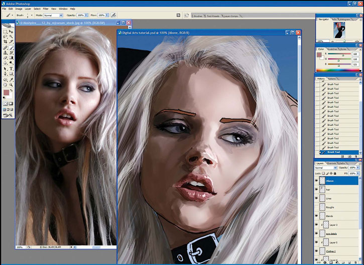 Суть в том, что снимок сильно приближают, чтобы детально видеть каждую пору, морщинку, и работают маленькими кистями. Их диаметр — буквально пара пикселей.