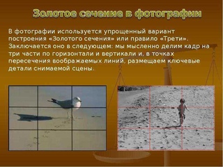 ΠΎΠ΄ΠΈΡΡ ΡΡΠΎ Π΄ΠΎΠ»ΠΆΠ½ΠΎ ΡΠ»Π΅Π΄ΡΡΡΠΈΠΌ ΠΎΠ±ΡΠ°Π·ΠΎΠΌ: ΡΠ°ΡΡΡ ΡΠΎΡΠΎΠ³ΡΠ°ΡΠΈΠΈ Π±ΠΎΠ»ΡΡΠ΅Π³ΠΎ ΡΠ°Π·ΠΌΠ΅ΡΠ° Π΄ΠΎΠ»ΠΆΠ½Π° ΠΎΡΠ½ΠΎΡΠΈΡΡΡΡ ΠΊ ΡΠ΅Π»ΠΎΠΌΡ ΠΊΠ°Π΄ΡΡ ΡΠ°ΠΊ, ΠΊΠ°ΠΊ ΡΠ°ΡΡΡ ΠΌΠ΅Π½ΡΡΠ΅Π³ΠΎ ΡΠ°Π·ΠΌΠ΅ΡΠ° ΠΎΡΠ½ΠΎΡΠΈΡΡΡ ΠΊ Π±ΠΎΠ»ΡΡΠ΅ΠΉ. ΠΡΡΠ»Π΅Π½Π½ΠΎ ΠΏΠΎΡΡΡΠΎΠΈΡΡ ΡΠΏΠΈΡΠ°Π»Ρ Π·ΠΎΠ»ΠΎΡΠΎΠ³ΠΎ ΡΠ΅ΡΠ΅Π½ΠΈΡ ΠΏΡΠΈ ΡΠΎΡΠΎΡΡΠ΅ΠΌΠΊΠ΅ ΠΊΡΠ°ΠΉΠ½Π΅ ΡΠ»ΠΎΠΆΠ½ΠΎ, ΠΏΠΎΡΡΠΎΠΌΡ ΠΌΠΎΠΆΠ½ΠΎ ΠΈΡΠΏΠΎΠ»ΡΠ·ΠΎΠ²Π°ΡΡ Π±ΠΎΠ»Π΅Π΅ ΠΏΡΠΎΡΡΠΎΠΉ Π²Π°ΡΠΈΠ°Π½Ρ. ΠΠ»Ρ ΡΡΠΎΠ³ΠΎ Π½ΡΠΆΠ½ΠΎ ΡΠ°Π·Π΄Π΅Π»ΠΈΡΡ ΠΊΠ°Π΄Ρ ΠΏΡΠΈ ΡΠΎΡΠΎΡΡΠ΅ΠΌΠΊΠ΅ Π½Π° ΡΡΠΈ ΡΠ°ΡΡΠΈ ΠΏΠΎ Π²Π΅ΡΡΠΈΠΊΠ°Π»ΠΈ ΠΈ Π³ΠΎΡΠΈΠ·ΠΎΠ½ΡΠ°Π»ΠΈ, Ρ ΠΎΡΠ½ΠΎΡΠ΅Π½ΠΈΠ΅ΠΌ ΠΊ ΠΎΠ±ΡΠ΅ΠΌΡ ΠΎΠ±ΡΠ΅ΠΌΡ ΠΊΠ°Π΄ΡΠ° 3:8, 2:8 ΠΈ 3:8.
