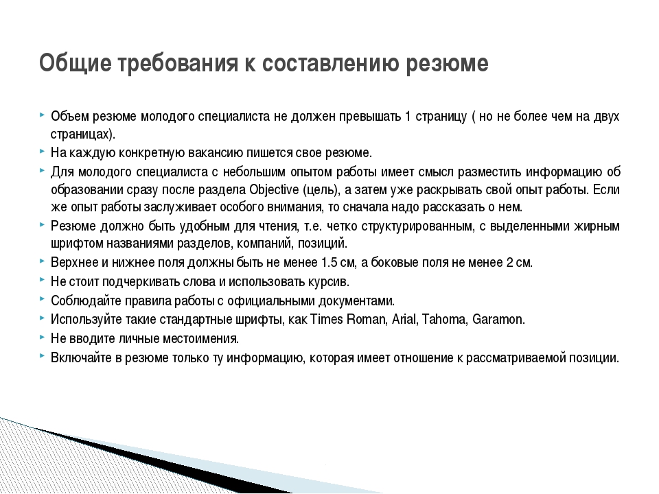 Используйте шрифты Times New Roman, Calibri или Arial. Все резюме должно иметь один кегль, шрифт и межстрочный интервал. Если вы не претендуете на творческую должность и не стремитесь поразить работодателя своим креативом, то лучше использовать белый фон, черный шрифт, полуторный интервал и размер кегля не менее 10. Помните, что краткость — сестра таланта, и сочинение на четырех страницах читать никто не станет. Оптимальный размер резюме — два листа: ни больше, ни меньше.