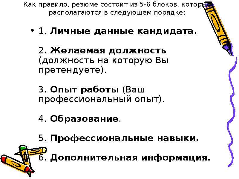 5. Компетенция. Обычно именно этот раздел резюме внимательно читают не только рекрутеры и HR-специалисты, но и непосредственные работодатели. В этом разделе уместно указать не только несколько личностных качеств, но и достижения, которых вы добились на прошлых работах.