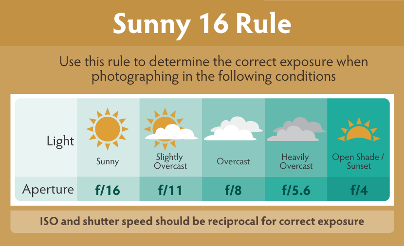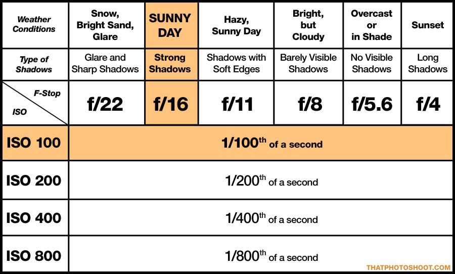 Правило Sunny 16 гласит, что в солнечные дни при диафрагме f/16 скорость затвора обратно пропорциональна значению ISO.