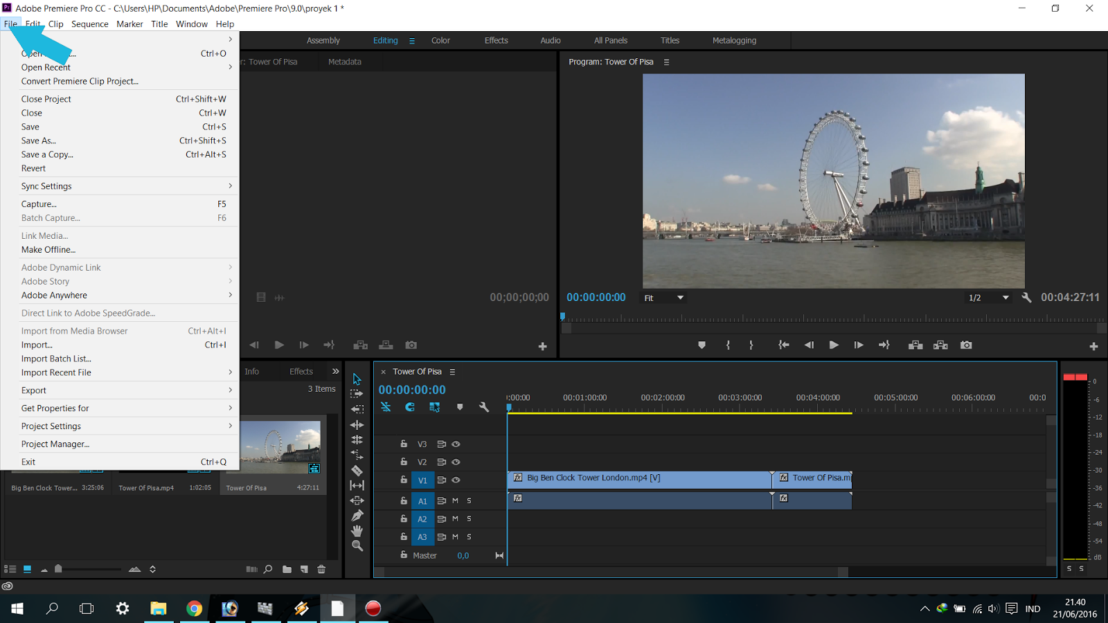 - Запустите Adobe Premiere Pro и щелкните «Импорт». Выберите видеоклип, который хотите отредактировать.