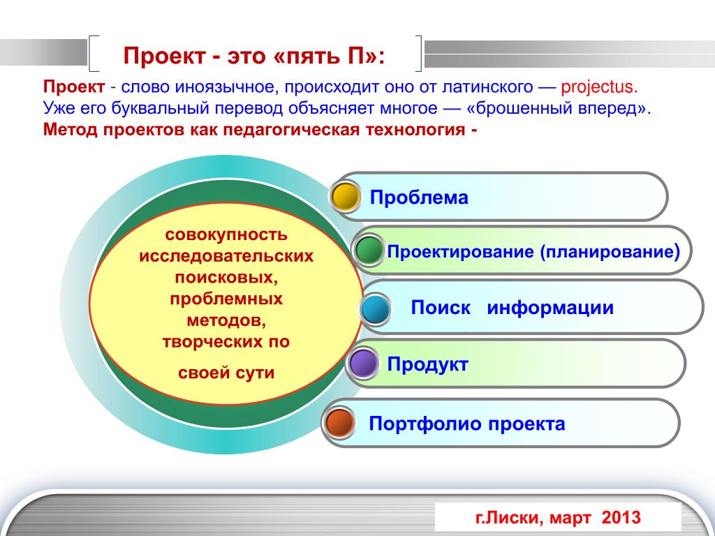 Проект — это «пять П «: Проблема, Проектирование (планирование), Поиск информации, Продукт, Презентация. Шестое «П» проекта — это его портфолио, т.е . папка, в которой собраны все рабочие материалы, в том числе черновики, дневные планы, отчеты и др.