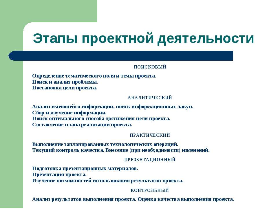 — Определение тематического поля и темы проекта.— Поиск и анализ проблемы.— Постановка цели проекта. |