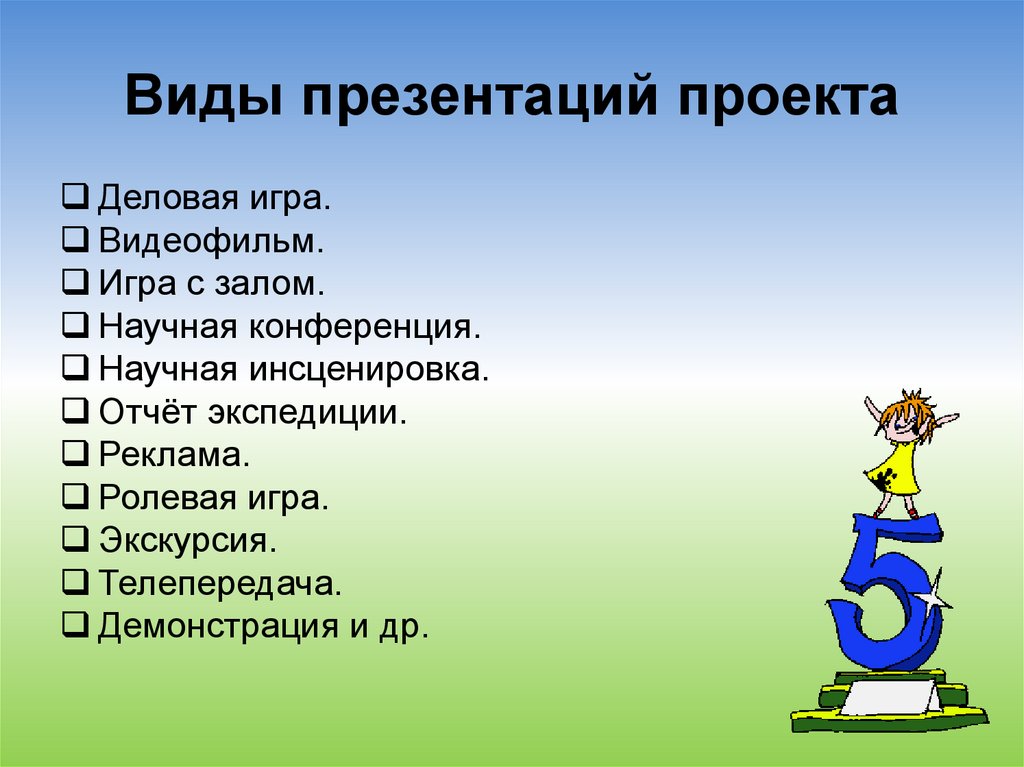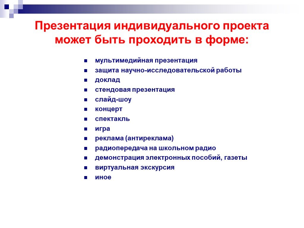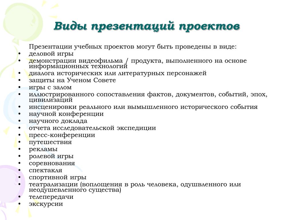 Презентацию проектов надо организовывать специальным образом. Здесь открываются самые широкие возможности для творческого поиска учителем организационных форм презентации. Это может быть: выставка, аукцион, спектакль, концерт, видеожурнал, демонстрация видеофильма, дегустация, рекламная акция, демонстрация моделей и т.д.