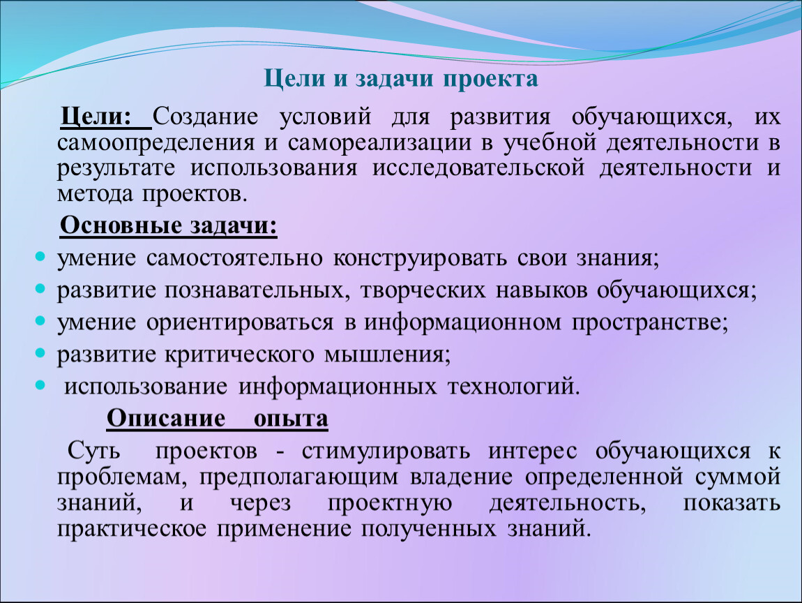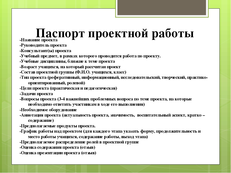 Когда учащимся ясна цель проекта, следует организовать работу по определению задач, которые указывают на промежуточные результаты и отвечают на вопрос, ЧТО должно появиться (быть сделано), чтобы цель проекта была достигнута (чтобы результат был получен). Задачи могут решаться в различной последовательности (иногда параллельно группа может работать над решением нескольких задач), их не следует путать с этапами работы (сбор информации, изготовление предмета, подготовка материалов к презентации и т.п.).