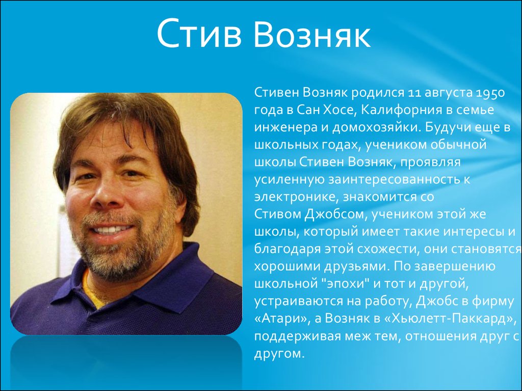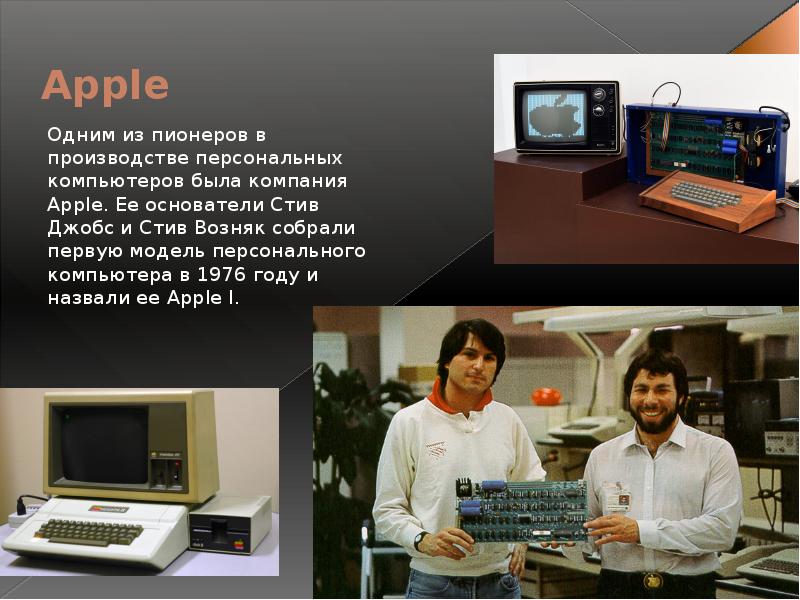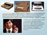 Возняк и Стив Джобс основали компанию Apple Computer в 1976 году. Благодаря техническим способностям Возняка и завораживающей энергии Джобса они представляли собой мощную команду. В этой презентации Стив Возняк рассказывает предысторию того, как Apple стала всемирно известной организацией, которую мы знаем сегодня.