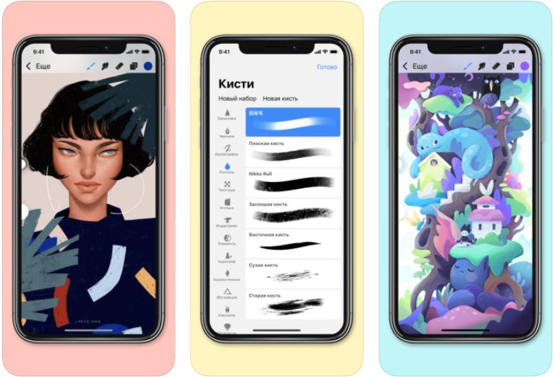 Он включает в себя более 100 типов кистей, множество материалов, различные шрифты, поддержку слоев и совместимость с 3D Touch на новых устройствах iOS.