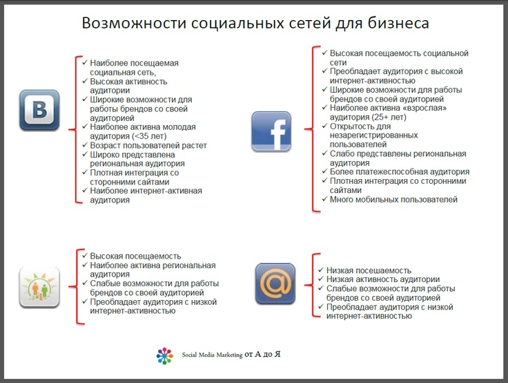 Пожалуй, главным плюсом такого продвижения бренда является то, что через соцсети можно найти абсолютно любую аудиторию для малого и среднего бизнеса. Преимущества социальных сетей: