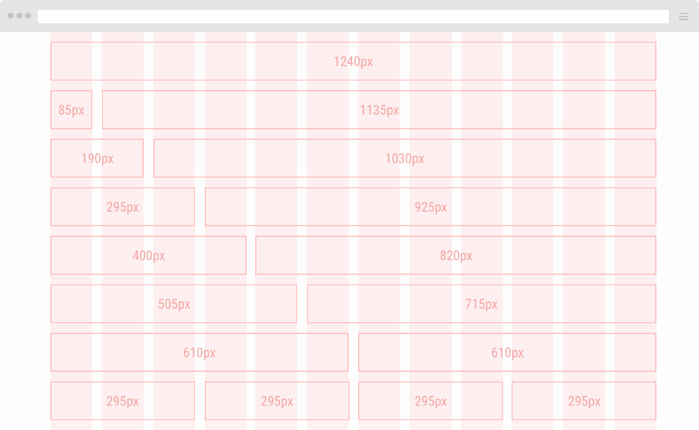 Пример 12 столбцов с 20-пиксельными промежутками и полями, установленными на 120 пикселей.