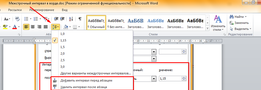Нажмите стрелку раскрытия рядом с «Интервал», затем нажмите стрелки «Перед абзацем» и «После абзаца».