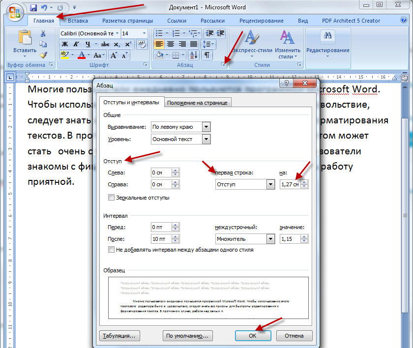 На вкладке «Главная» нажмите кнопку запуска абзаца, чтобы от показать диалоговое окно «Абзац».