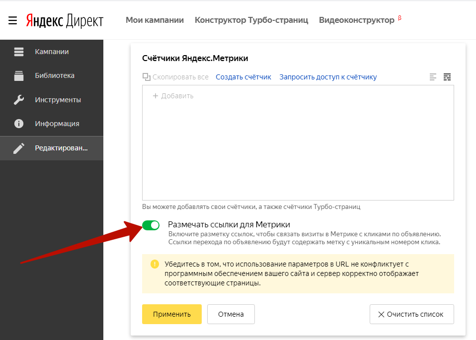 Номер счетчика нужно добавить в блок «Метрика» на странице создания кампании в Яндекс.Директе. И поставить галочку в окошке «Размечать ссылки для Метрики».