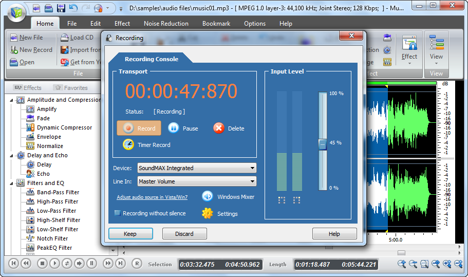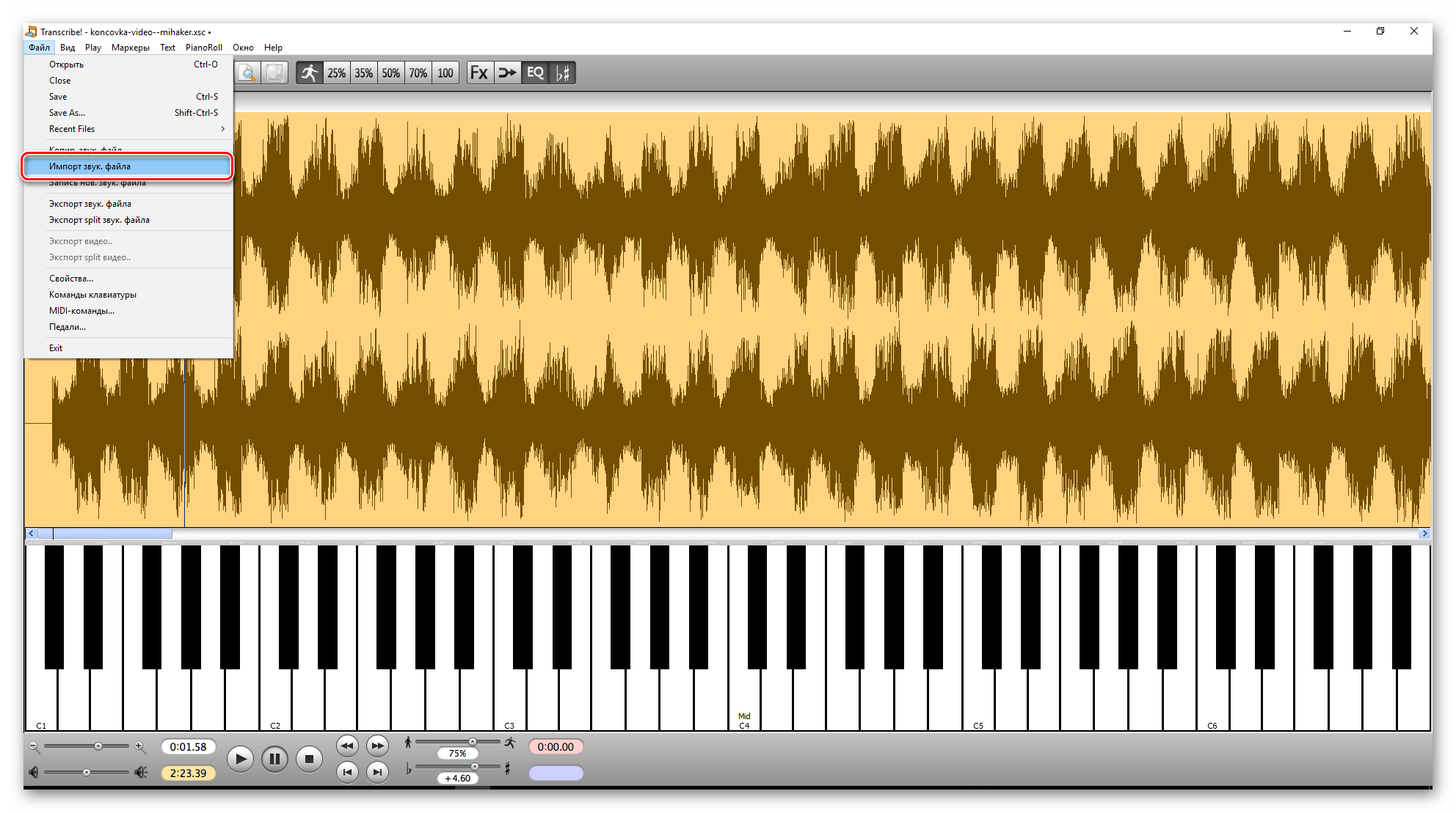 Музыкальный редактор предоставляет полный набор инструментов для детального анализа параметров звука, в частности частотного спектра, отдельные диапазоны которого можно редактировать по своему усмотрению.