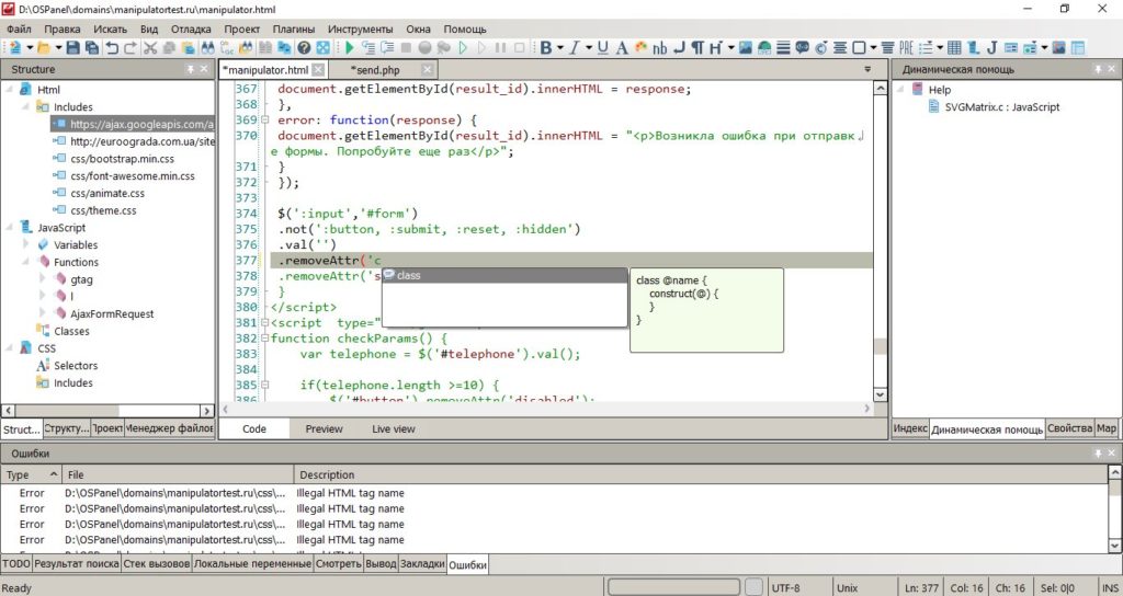 При работе с JavaScript, HTML и CSS-файлами PhpStorm предлагает варианты автодополнения для тегов, ключевых слов, переменных, параметров и функций на основе DOM и учитывает особенности популярных браузеров, таких как Firefox и Chrome.