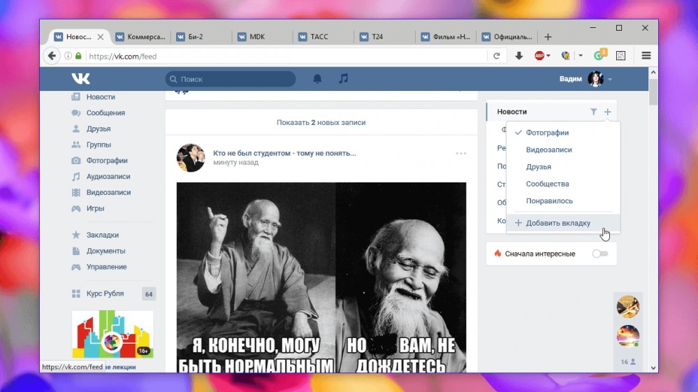 Внимание! ВК ограничивает в количестве новостных потоков, так что больше 10 вкладок создать не удастся.