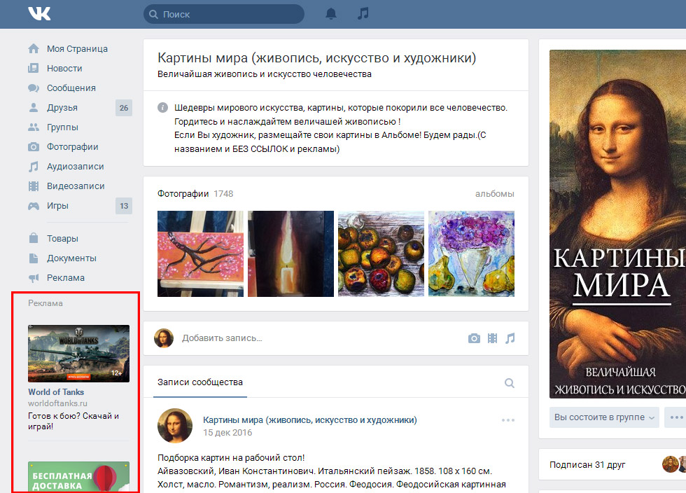Кроме ленты новостей и историй, есть возможность показывать рекламу в боковой части сайта.