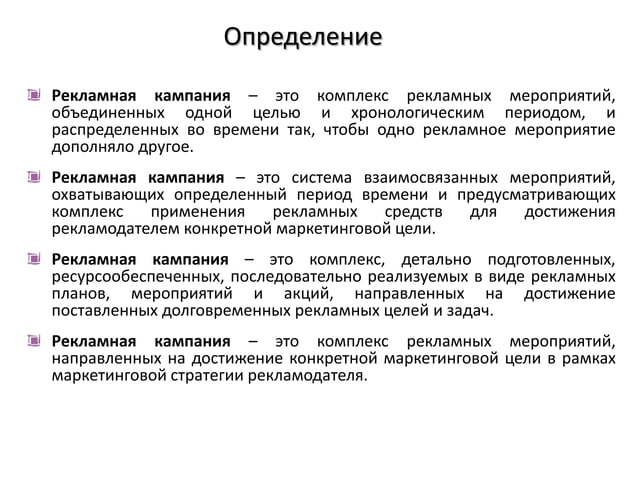 Кампания — это скоординированная серия рекламных мероприятий, построенных вокруг одной идеи и предназначенных для достижения заранее определенной цели. Кампания – это подходящее мероприятие, применимое ко всей рекламной программе. Рекламные решения руководствуются предыдущими результатами. Их интересует не только цель использования рыночного канала распределения, но также цена и продукт.
