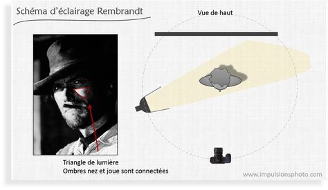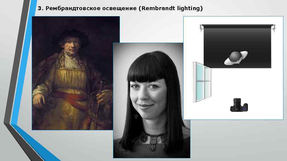 Самая распространенная схема освещения носит название «свет Рембрандта». Получила она его в честь знаменитого голландского живописца Рембрандта Ван Рейна, который в большинстве своих портретов использовал свет, создающий светотень на лице человека в виде треугольного уголка под глазом на темной стороне лица.