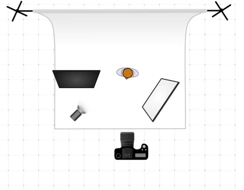 Для создания снимков, используемых в данном уроке фотографии, была взята студийная вспышка со стандартным рефлектором, с помощью которой получились довольно жесткие (резкие) тени. Но вполне можно пробовать воссоздать классическую модель освещения с другим световым модификатором. Также использовался отражатель, размещенный под углом 45 градусов к вспышке, чтобы подсветить тени и не потерять детали изображения в тенях. Кроме этого применялся флаг, чтобы свет от моноблока не попадал напрямую на фон.