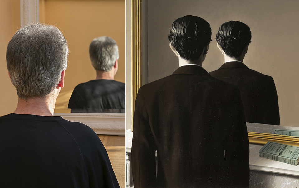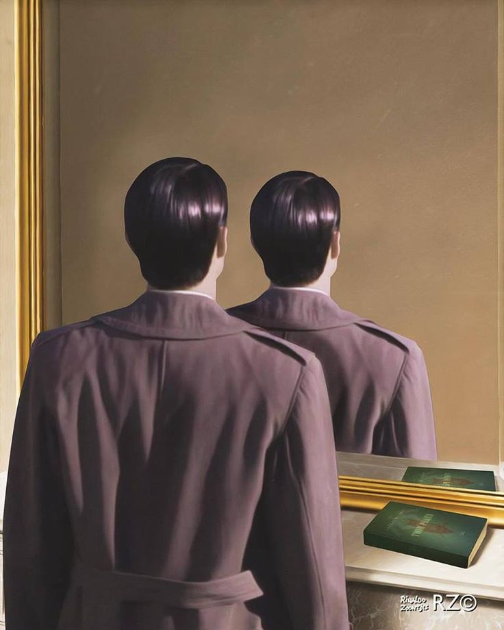Личность человека перформативна; мы контролируем свое поведение и то, как мы общаемся с людьми. Но можем ли мы действительно по-настоящему узнать человека из-за этой субъективности и непостоянства действий, или у нас только поверхностное впечатление? Что заставляет меня усомниться в этой картине, так это то, насколько хорошо мы когда-либо узнаем человека, если мы видим только одну его сторону, и, показывая одну сторону человека в объекте, зеркале, которое должно отображать реальность, Магритт демонстрирует это через визуальную метафору. Книга представлена правильно, поскольку является постоянной, объективной и определенной сущностью. Когда она написана, слова в книге не меняются. Во многих своих картинах Магритт имеет дело с затемнением или сокрытием лица человека. В «Сыне человеческом», «Влюбленных» и «Великой войне» также можно увидеть этот прием. Я согласен с тем, что тревога, неуверенность и любопытство являются основными эмоциями, которые вызывает техника. Фокусной частью тела является лицо; мы знаем людей по тому, как они используют свое лицо.