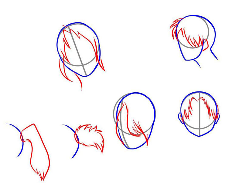 Нарисуйте волосы. Обратите внимание, что у персонажа они как бы торчат вверх.