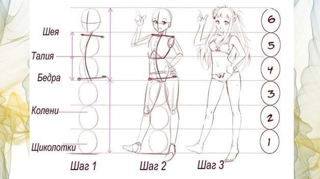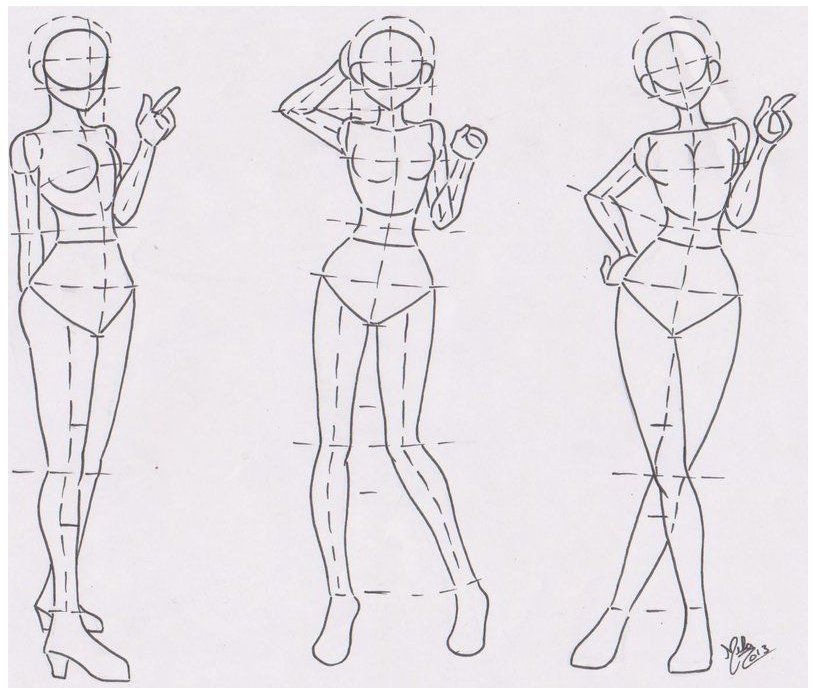 1. Рисуем вертикальную еле заметную линию. Делим эту линию пополам — рисуем горизонтальную линию – талия. 2. Вверх и вниз от линии талии рисуем фигуру наподобие песочных часов — плечи и бедра. 3. Это расстояние делим на 3 части (песочные часы) и 1 часть его будет голова – единица измерения. Рисуем голову, шею и конечности: длина рук — до бедер, длина ног – расстояние от бедер до высоты головы. 4. Прорисовываем мелкие детали: части лица, волосы, ладони, ступни. 5. Прорисовываем детали одежды. Удаляем вспомогательные линии и продолжаем работать в цвете.