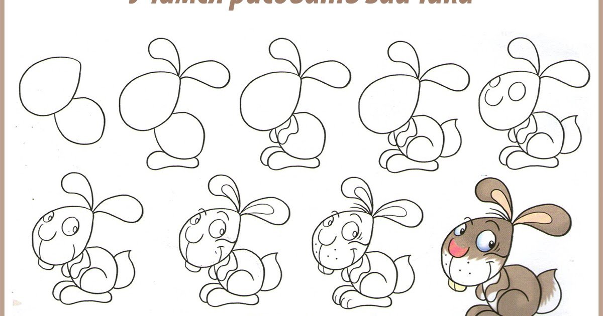 Детям, Животные, Забавные, Заяц, Легкие, Мультяшные, Поэтапные, Простые, Черно-белые