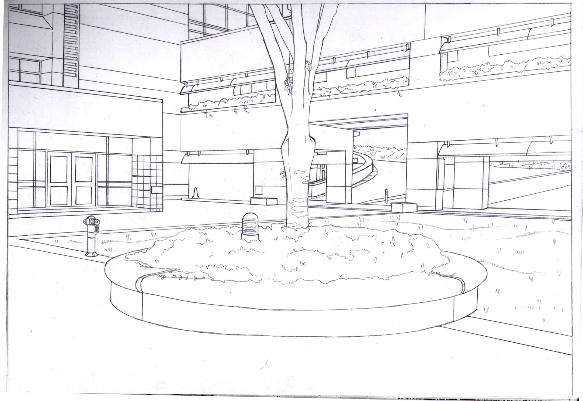 И так, для начала рисуем общий контур школы. Следом рисуем лестницы, окна, двери, крышу и так далее.
