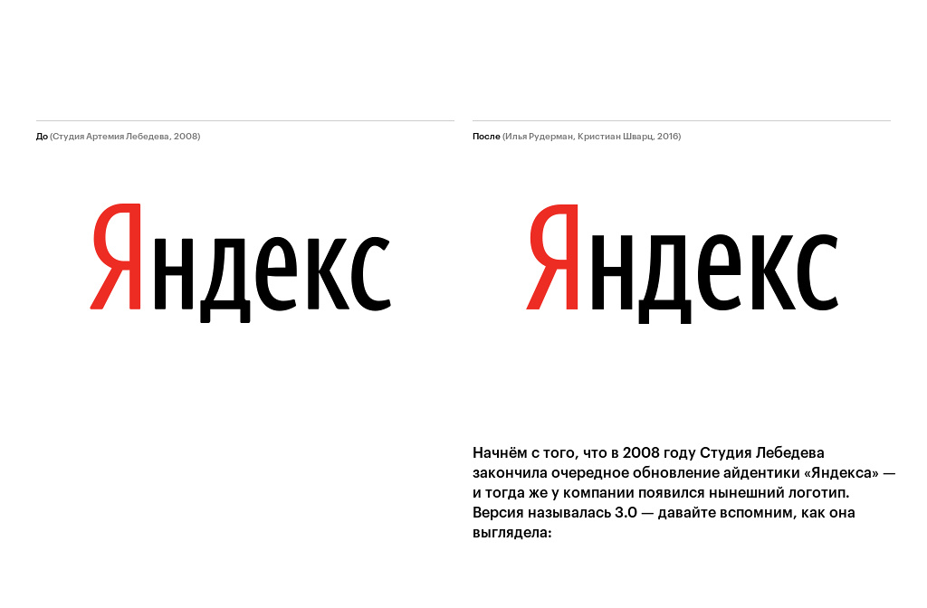Редизайн нужен, когда возникает ощущение, что в текстовом логотипе что-то не так. Как в нашем кейсе с тюнингом текстового логотипа Yandex. В нем были странности на уровне микротипографики, которые не бросались в глаза и не раздражали никого в компании.